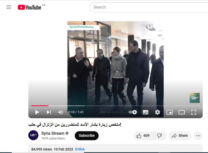 وبموجب تدقيق في الصورة، نعثر عليها في مشاهد مصورة نشرتها قنوات سورية في 10 شباط 2023. وتعود الى زيارة الأسد للمتضررين في حلب من جراء الزلزال المدمر، الذي ضرب شمال سوريا.