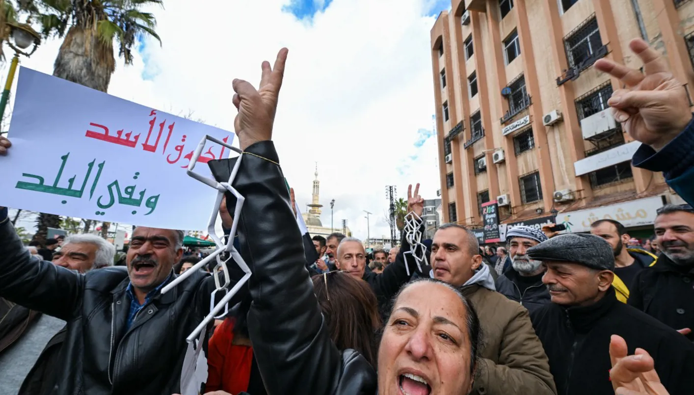 أشخاص يحتفلون بانهيار حكم بشار الأسد أثناء تجمعهم في أحد شوارع السويداء (أ ف ب)