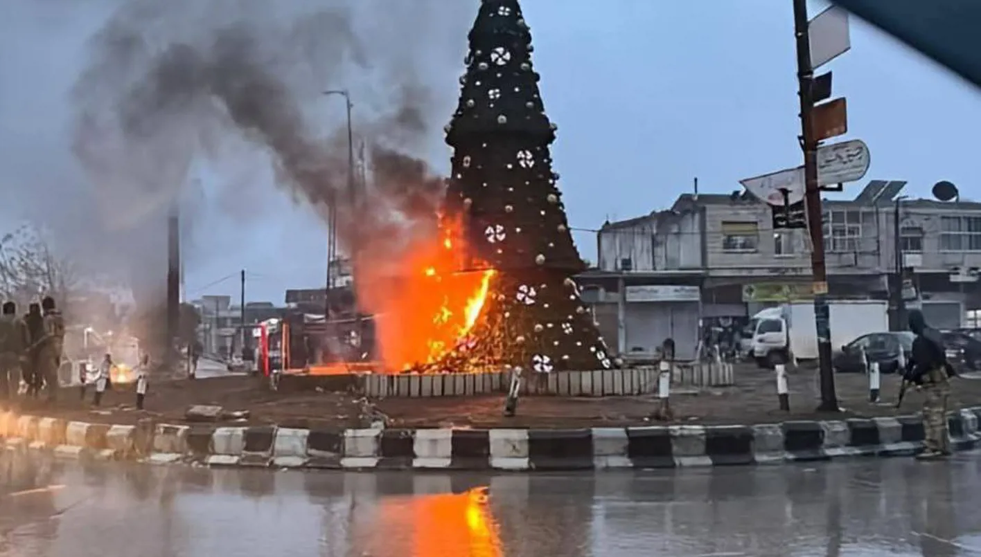 أقدم مجهولون على إحراق شجرة الميلاد التي زينت في ساحة مدينة السقيلبية في محافظة حماة في سوريا.
