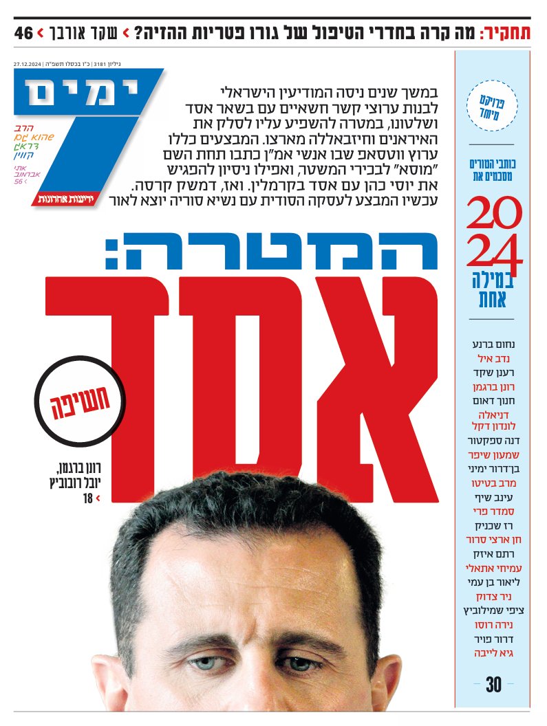 ومع هروب الأسد إلى موسكو، انتهت أيضاً الجهود الطويلة للتوصل إلى اتفاق سري معه. الآن ضعوا أعينكم الاستخبارية إلى الأمام. أين؟ يقول أحد كبار المسؤولين في مجتمع الاستخبارات: "الثورة المقبلة ستكون في إيران... أمامنا فترة مثيرة للاهتمام للغاية، وقبل كل شيء، فترة إيجابية للغاية بالنسبة للقوة الإقليمية: إسرائيل".