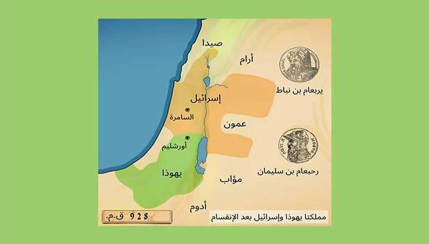 ويشير وصف الخريطة إلى تقسيم المملكة عام 931 قبل الميلاد إلى مملكتي إسرائيل ويهوذا.