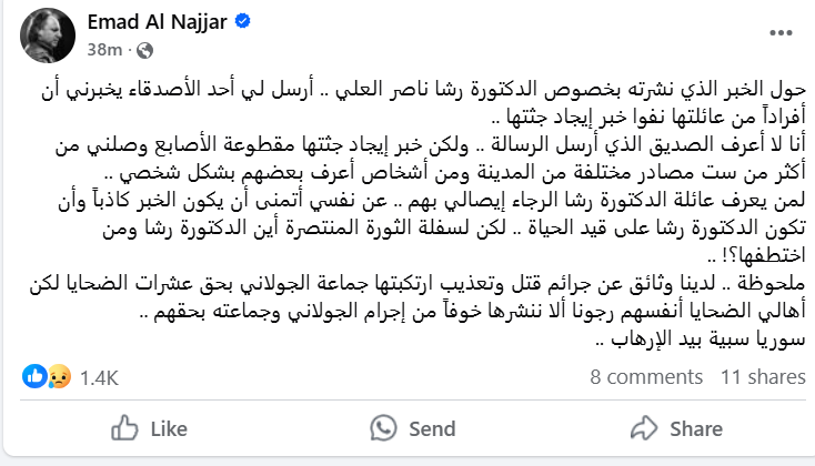 كما طلب النجّار مِمّن يعرف عائلة الدكتورة رشا العلي إيصاله بهم، قائلاً: "عن نفسي، أتمنّى أن يكون الخبر كاذباً وأن تكون الدكتورة رشا على قيد الحياة، لكن لسفلة الثورة المنتصرة أين الدكتورة رشا ومن اختطفها؟!".