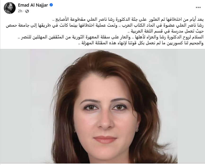 أنباء متضاربة عن مصير الأكاديمية السورية المختطفة في حمص رشا العلي... والعائلة تنفي العثور على جثّتها