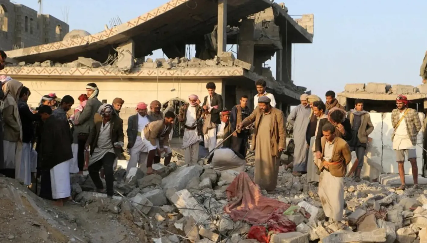 أشخاص يتجمعون على أنقاض منزل تعرض لغارة أميركية في صعدة باليمن
