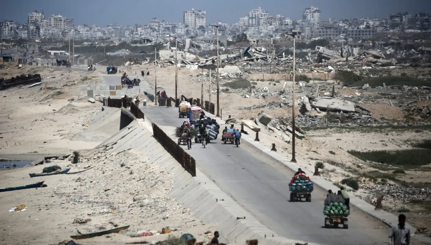 فلسطينيون ينقلون البضائع على طول طريق الرشيد الساحلي الذي يربط بين مدينة غزة في الشمال والنصيرات في الجزء الأوسط من الأراضي الفلسطينية (أ ف ب)