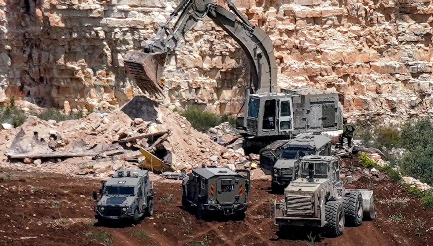 جرافة عسكرية إسرائيلية تهدم مبنى بعد أن قتلت شخصين بداخله (أ ف ب)