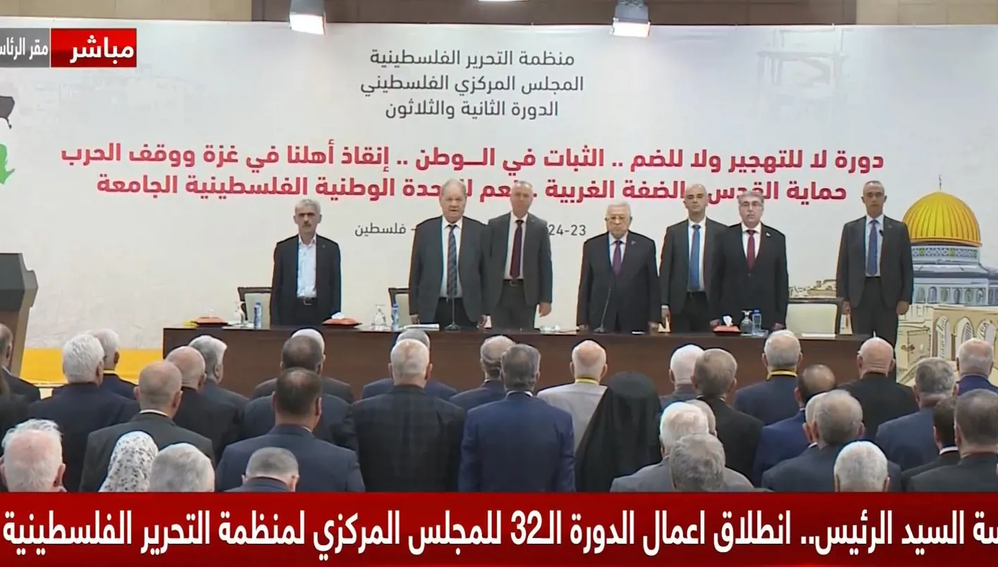 الجلسة الافتتاحية للدورة الـ32 للمجلس المركزي الفلسطيني في رام الله، بعنوان: "لا للتهجير ولا للضم- الثبات في الوطن- إنقاذ أهلنا في غزة ووقف الحرب- حماية القدس والضفة الغربية، نعم للوحدة الوطنية الفلسطينية الجامعة".