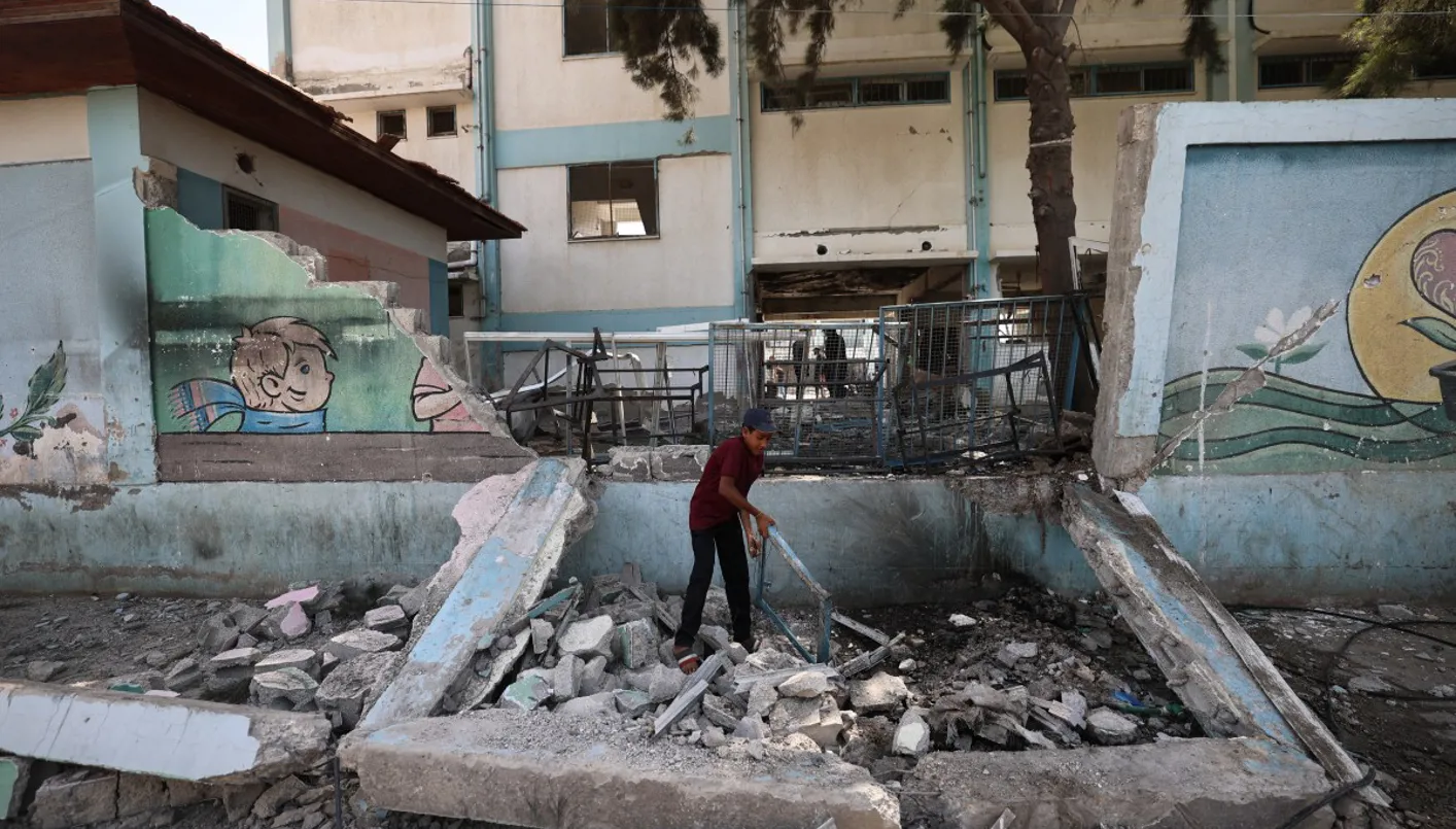 طفل فلسطيني يتفقد الأضرار في مدرسة تابعة للأونروا تستضيف لاجئين فلسطينيين (أ ف ب)