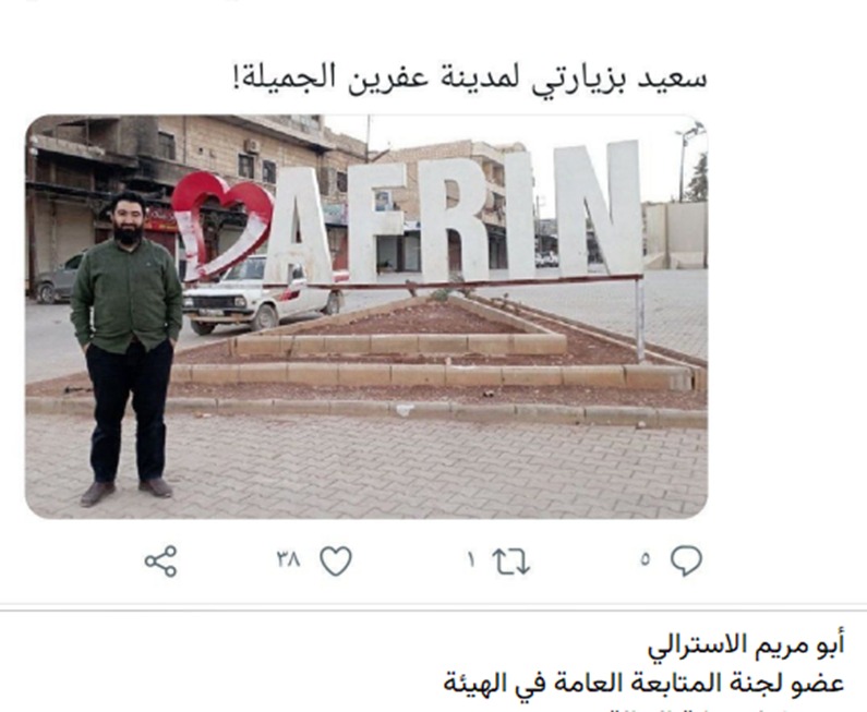 وفي 13 تموز/ يوليو من العام الماضي، نشر حساب باسم المحامي عصام الخطيب على تلغرام، وهو منشق عن الهيئة وكان يشغل منصب قاضٍ عسكري بارز فيها، صورة قال إنها لأبو مريم الأوسترالي، مُعرِّفاً صاحب الصورة بأنه جهادي يُدعى إبراهيم بن مسعود، ومعلقاً بأنها التقطت في عفرين.