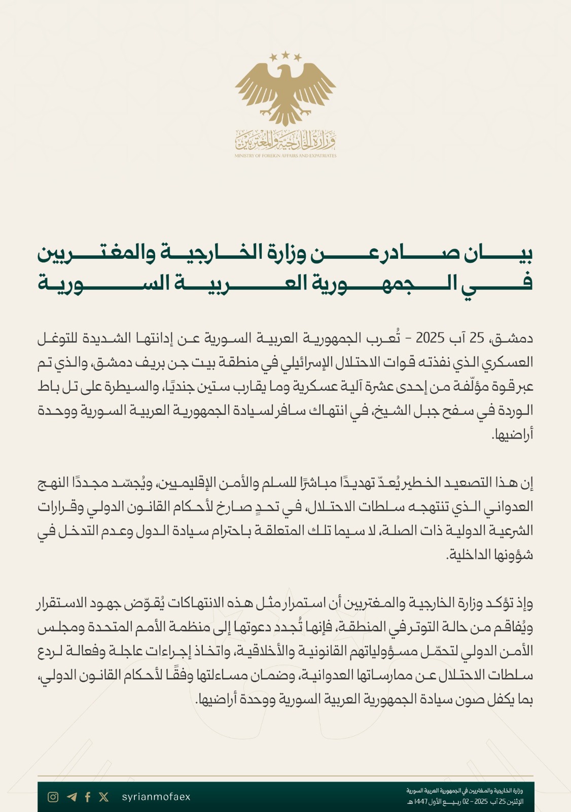 وفي وقت لاحق، أدانت سوريا توغل الجيش الإسرائيلي في منطقة بيت جن بريف دمشق ودعت الأمم المتحدة إلى اتخاذ خطوات عاجلة.
