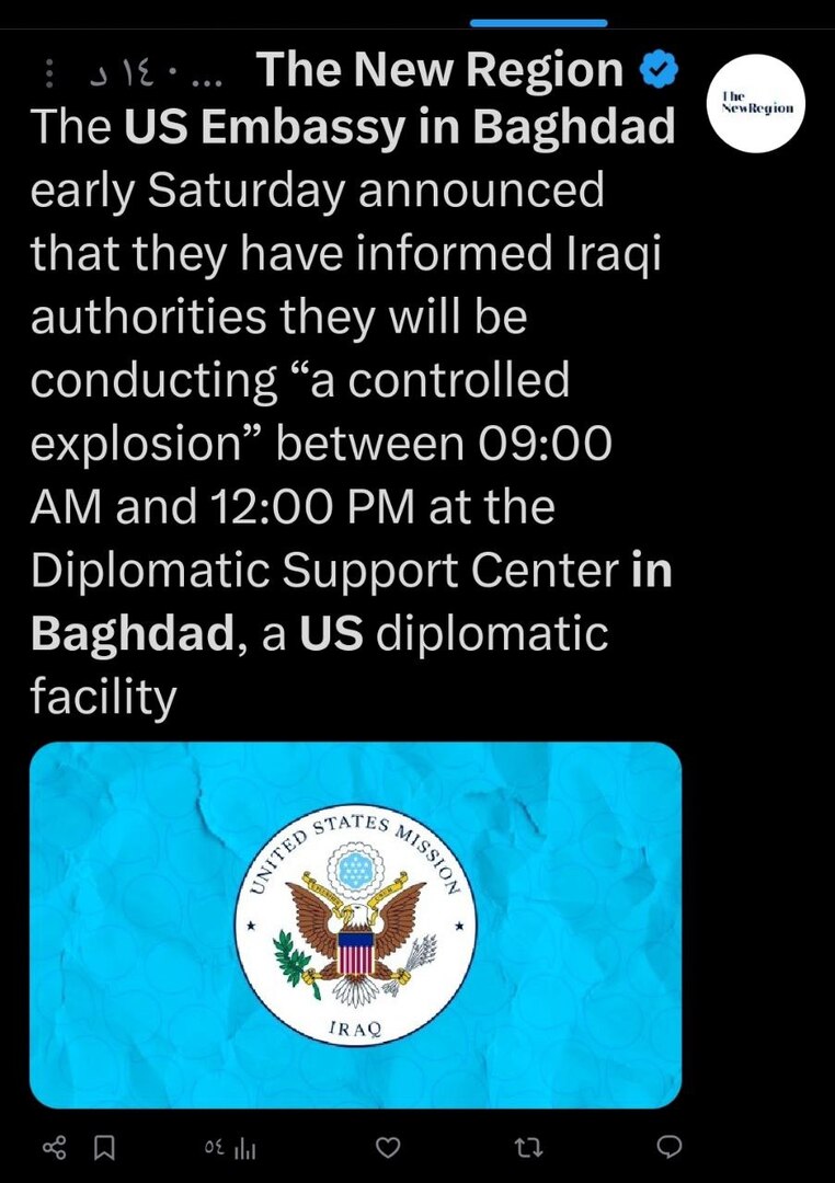 أعلنت السفارة الأميركية في بغداد، اليوم السبت، عن تنفيذ تفجير "مسيطر عليه" داخل مركز الدعم الدبلوماسي الواقع في مطار بغداد الدولي.