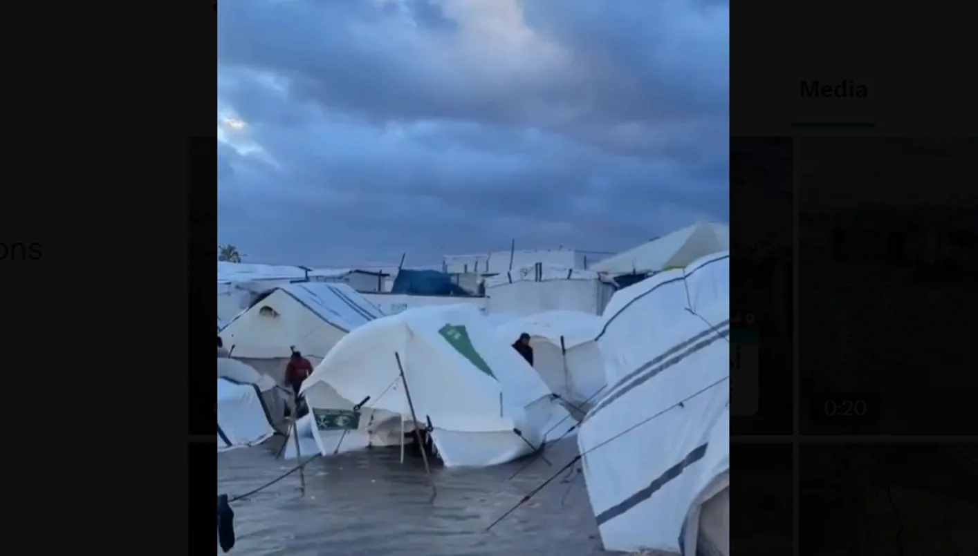انتشرت عبر مواقع التواصل الاجتماعي مشاهد لغرق خيام النازحين قبالة شاطئ خان يونس جنوبي قطاع غزة، جرّاء الأمطار الغزيرة والسيول مع تأثّر الحوض الشرقي للمتوسط بمنخفض جوي بارد.