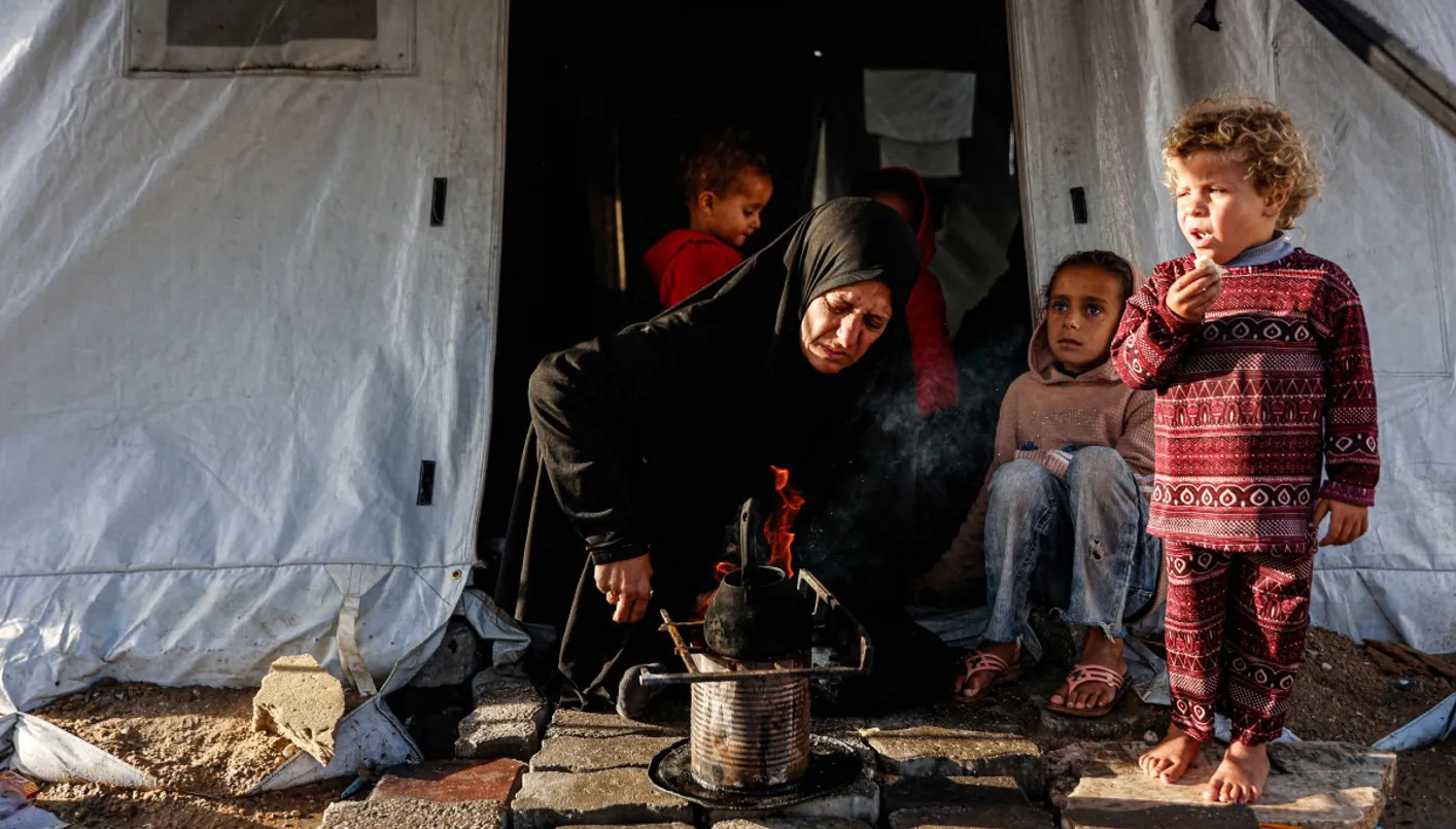 امرأة فلسطينية نازحة تسخن قدراً بينما ينظر إليها الأطفال من خارج خيمتها التي كانت بمثابة منزل لها، في ظل هطول الأمطار وبرودة الشتاء التي تشهدها المنطقة، في مدينة غزة. (أ ف ب)