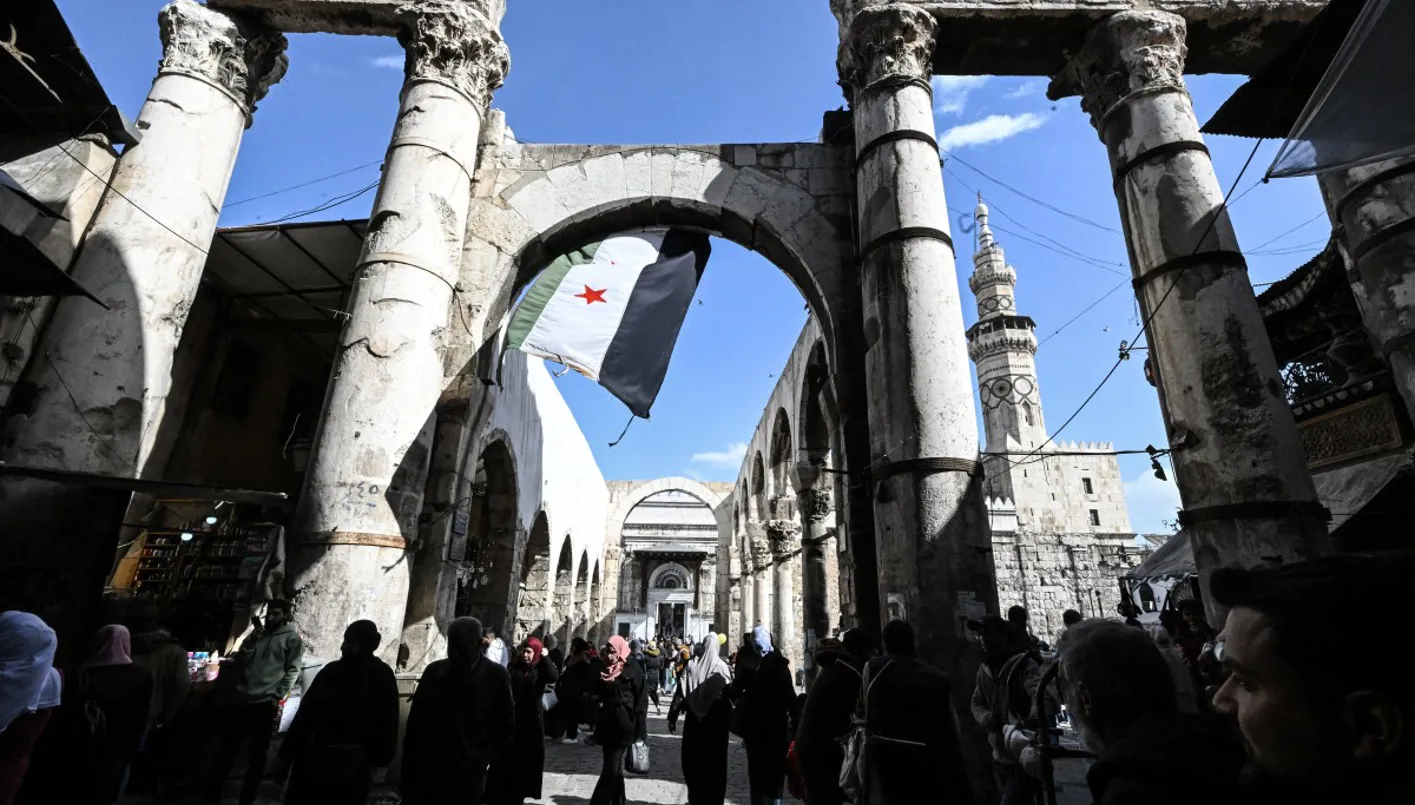 سوريون يتسوقون أمام الجامع الأموي في البلدة القديمة بدمشق. (أ ف ب)