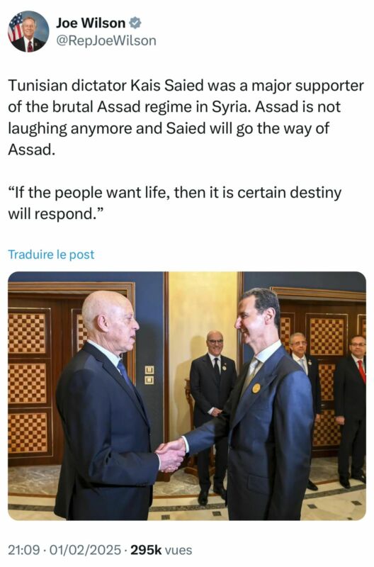 السيناتور الأميركي جو ويلسون يتوعّد الرئيس التونسي بمصير الأسد... ما خلفيات الهجوم؟