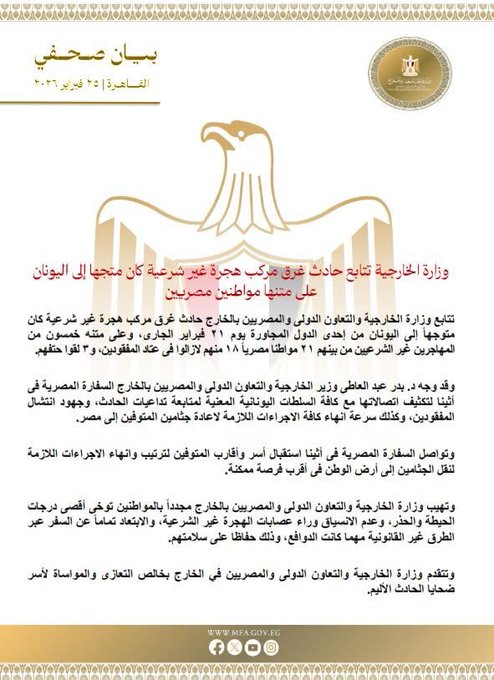 ووجه وزير الخارجية والهجرة بدر عبد العاطي السفارة المصرية في أثينا لتكثيف اتصالاتها مع كافة السلطات اليونانية المعنية لمتابعة تداعيات الحادث، وجهود انتشال المفقودين، وكذلك سرعة إنهاء كافة الإجراءات اللازمة لإعادة جثامين المتوفين إلى مصر.