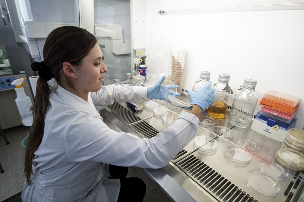 طالبة تعمل في مختبرات جامعة كوستاريكا لإجراء دراسات على فرو الكسلان، في سان خوسيه (أ ف ب)