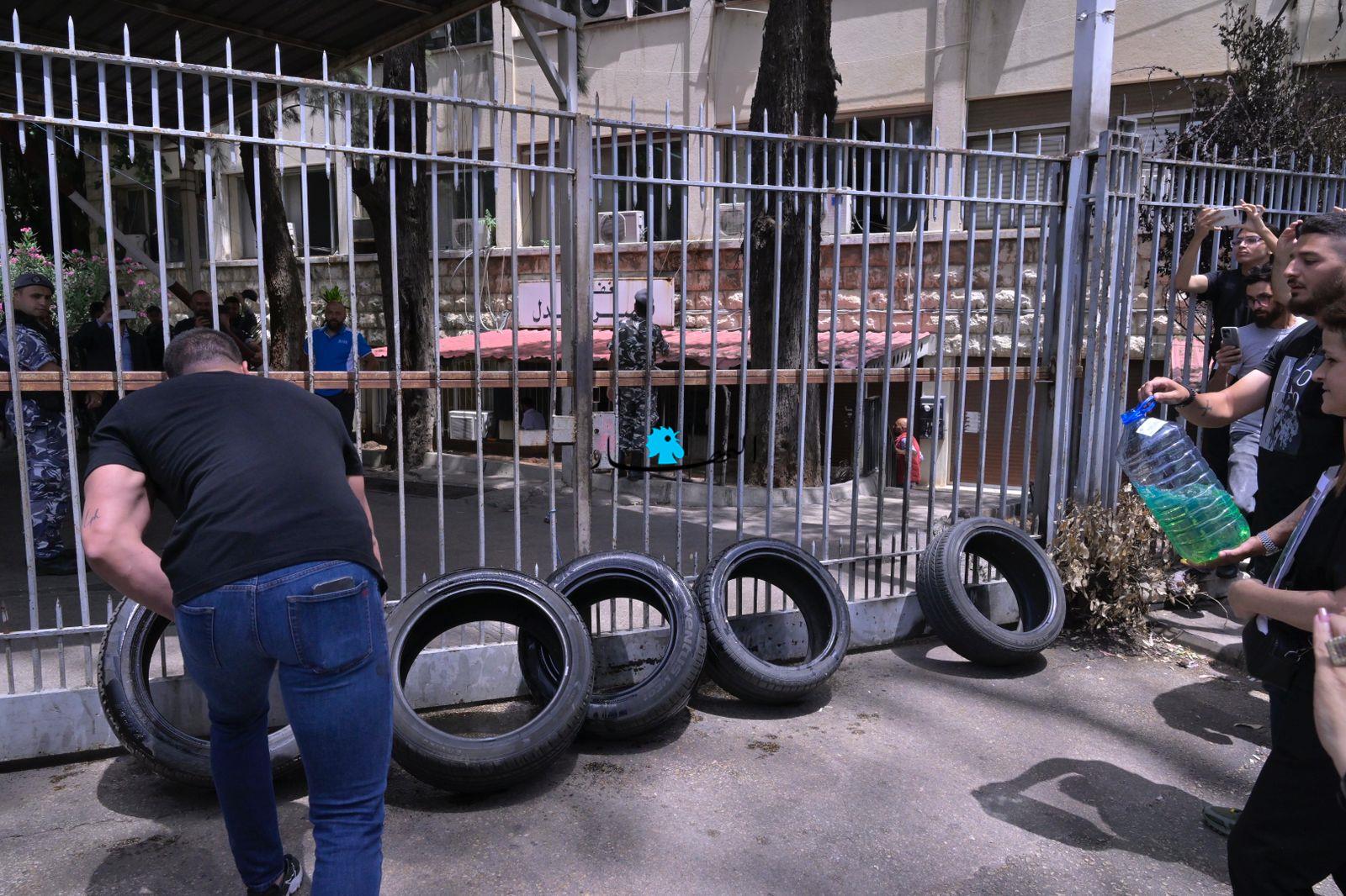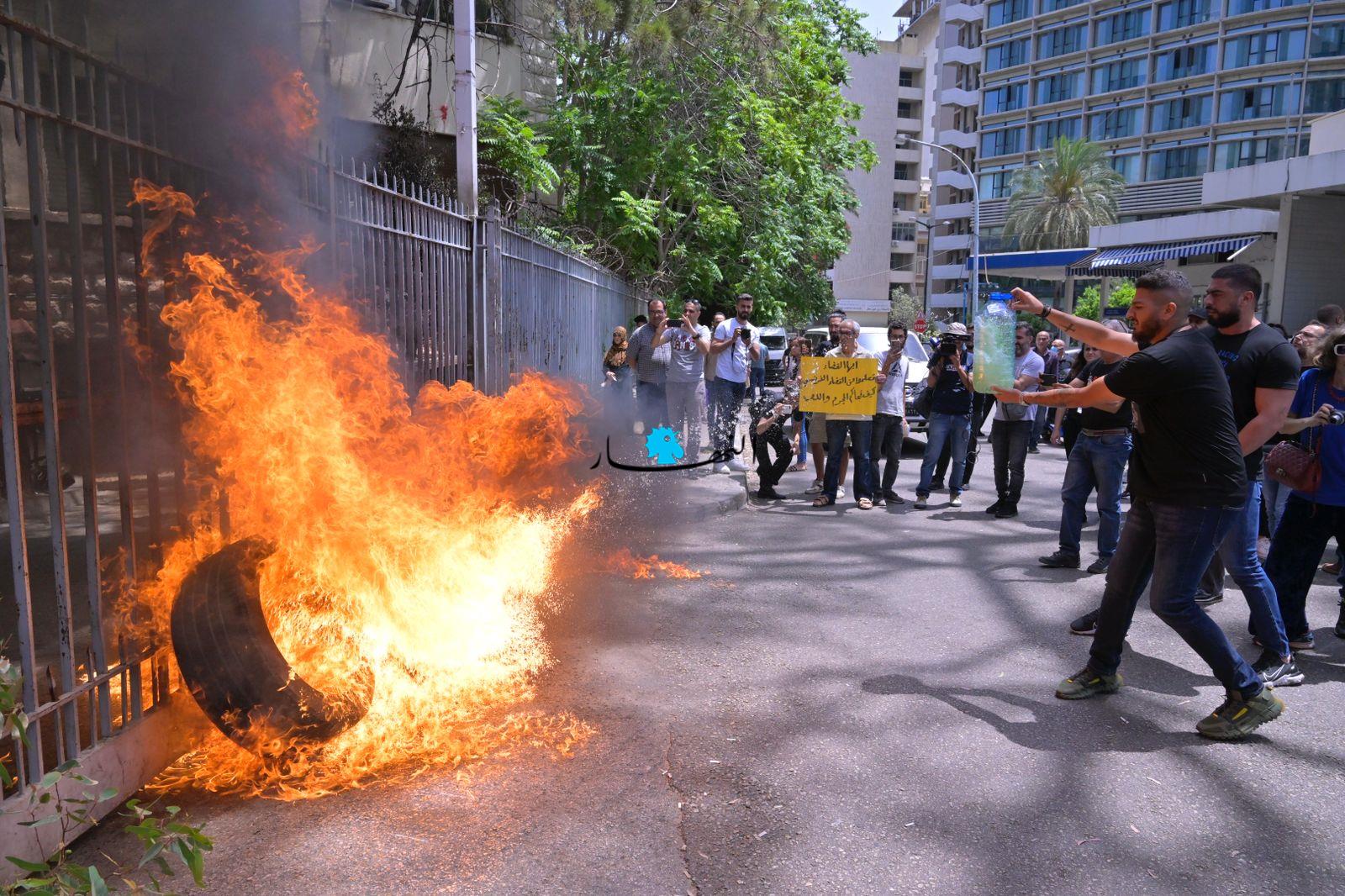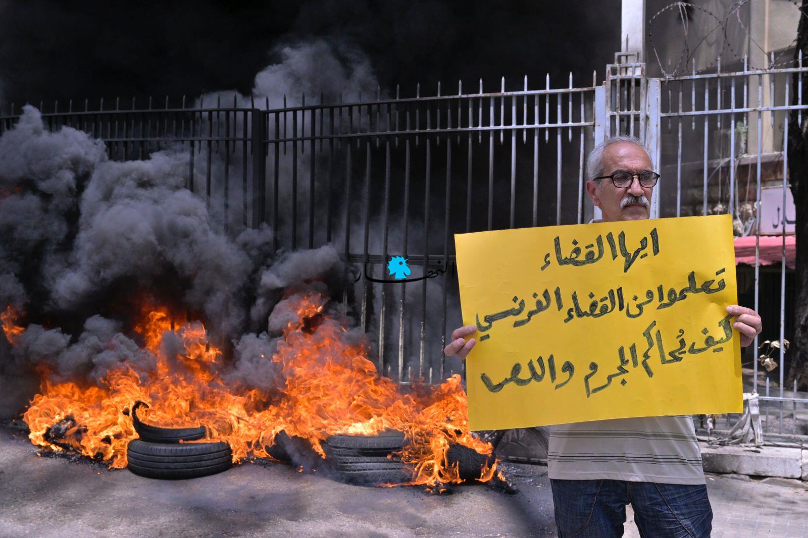 إشعال إطارات من قبل أهالي ضحايا انفجار 4 آب أمام مدخل قصر العدل (نبيل إسماعيل).