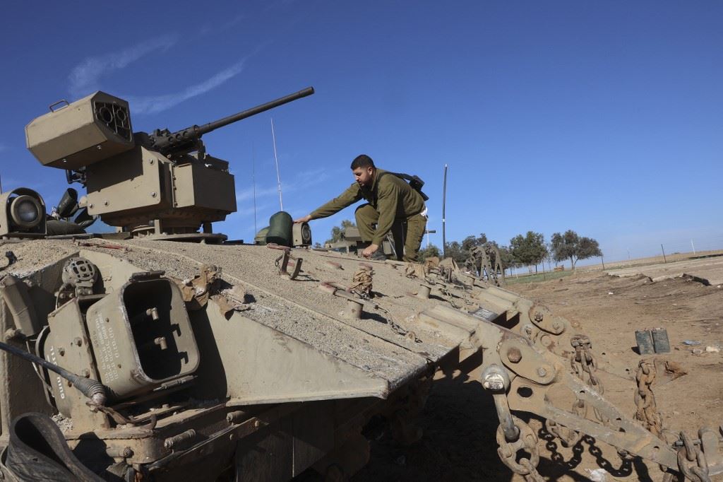 جندي إسرائيلي يتسلّق على متن ناقلة أفراد مسلحة في جنوب إسرائيل بالقرب من الحدود مع قطاع غزة (أ ف ب).
