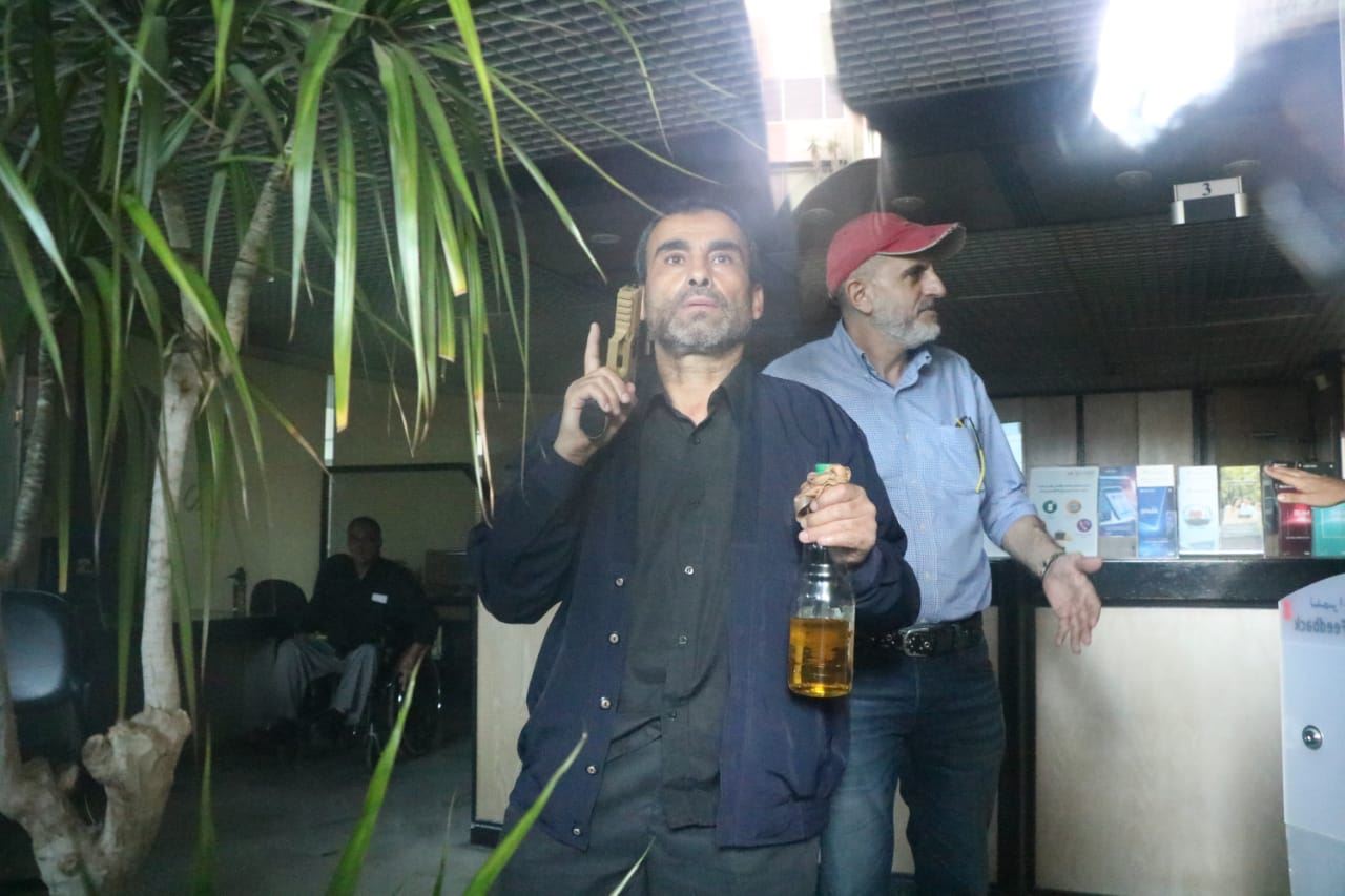 المودع علي الساحلي يحمل قنينة بنزين وسلاحاً داخل المصرف (حسن عسل).