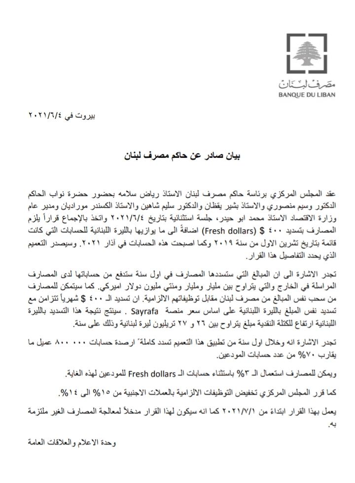 وأفاد بيان وحدة الاعلام والعلاقات العامة، في مصرف لبنان ، بأنه "اتخذ بالإجماع قرارا يلزم المصارف بتسديد 400 $ (Fresh dollars) اضافة الى ما يوازيها بالليرة اللبنانية للحسابات التي كانت قائمة بتاريخ تشرين الاول من سنة 2019 وكما اصبحت هذه الحسابات في آذار 2021. وسيصدر التعميم الذي يحدد التفاصيل هذا القرار.
