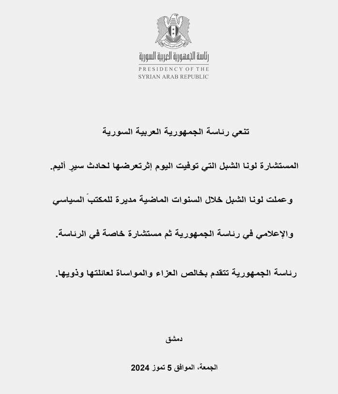 نعت الرئاسة السورية مستشارة الرئيس السوري لونا الشبل بعد أيّام على تعرّضها لحادث سير.