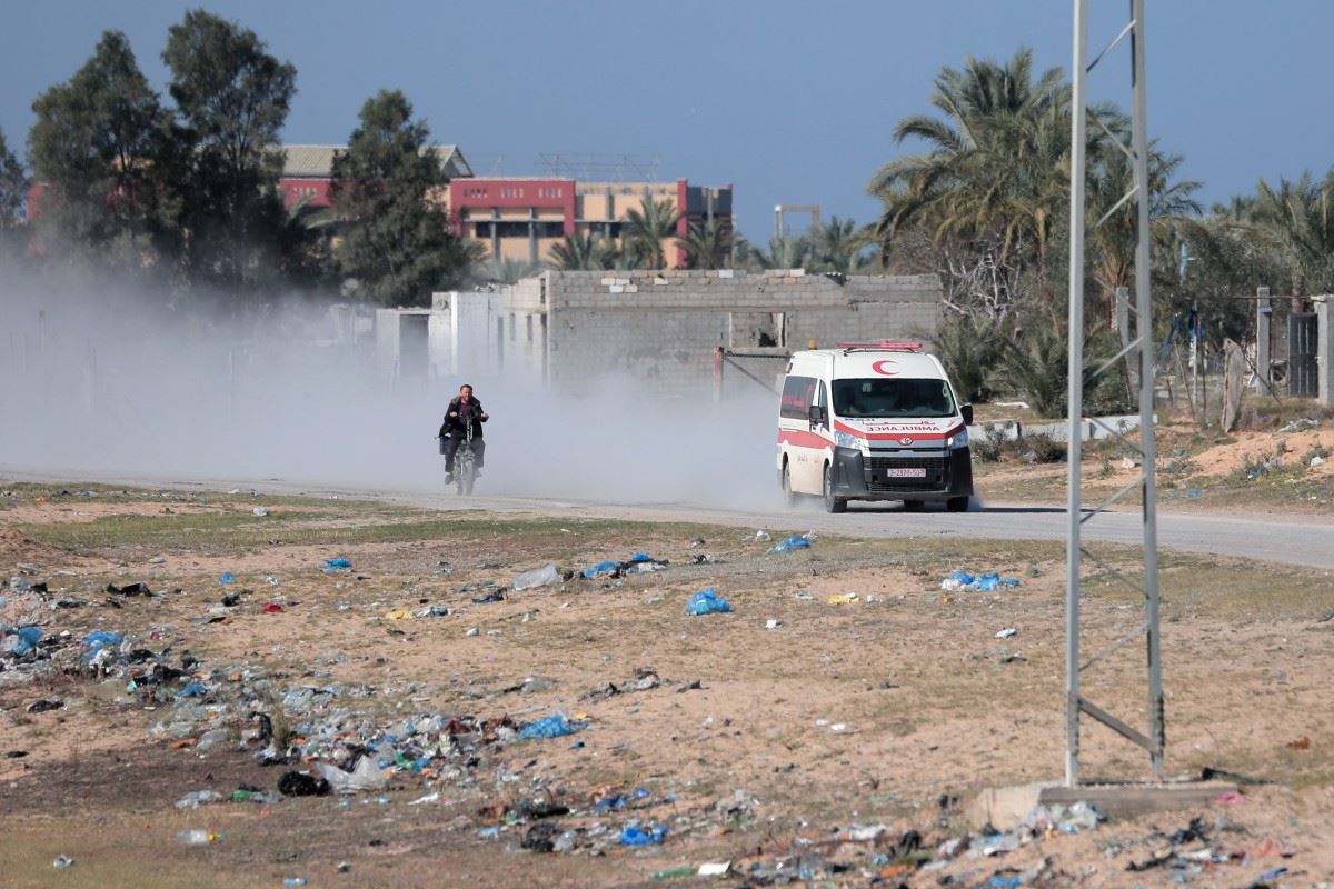 رجل يركب دراجة نارية خلف سيارة إسعاف بالقرب من منطقة مدينة حمد في خان يونس بجنوب قطاع غزة (أ ف ب).