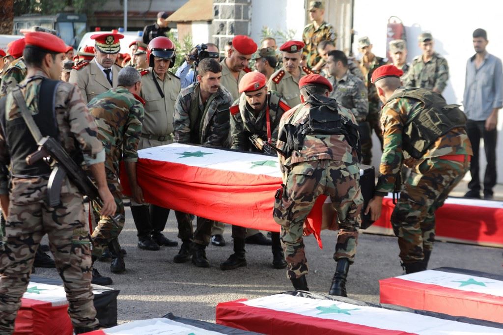 جنود سوريون يحملون توابيت خلال جنازة ضحايا هجوم بطائرة بدون طيار استهدف أكاديمية عسكرية سورية (أ ف ب).