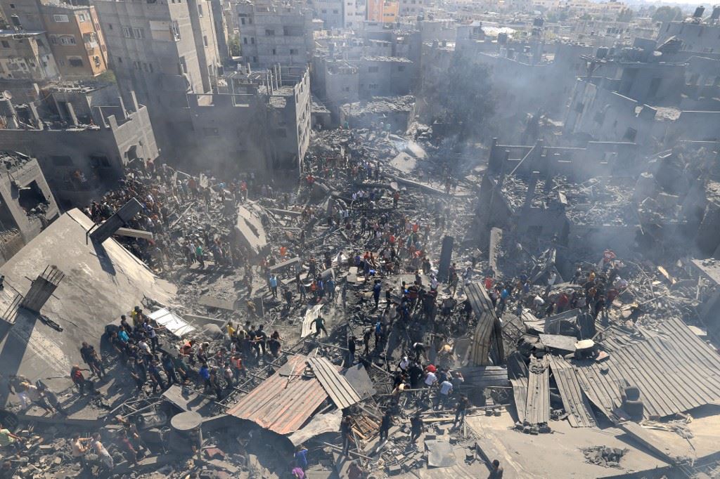 فلسطينيون يبحثون عن ناجين وجثث ضحايا بين أنقاض المباني التي دمرت خلال القصف الإسرائيلي في خان يونس (أ ف ب).