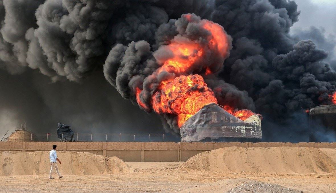 حرائق مشتعلة في براميل نفط في ميناء الحديدة اليمني بعد الغارات الإسرائيلية (أ ف ب).