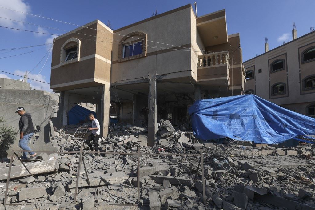 رجال فلسطينيون يتفقدون منزل زعيم الجهاد الإسلامي جهاد غنام الذي أصيب بأضرار جسيمة من جراء غارة إسرائيلية في رفح جنوب قطاع غزة (9 أيار 2023، أ ف ب).
