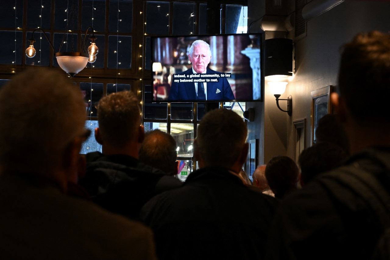 اشخاص في حانة وسط لندن يتابعون الخطاب المتلفز لملك بريطانيا تشارلز الثالث (9 أيلول 2022، أ ف ب).