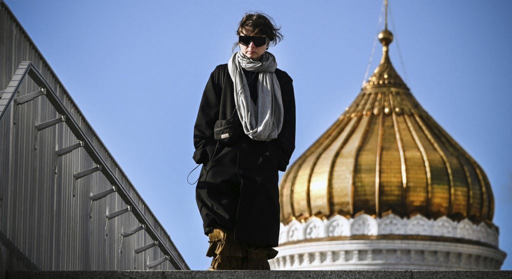 امرأة تمر قرب إحدى قباب كاتدرائية المسيح المخلص في موسكو (11 ت1 2022، أ ف ب).