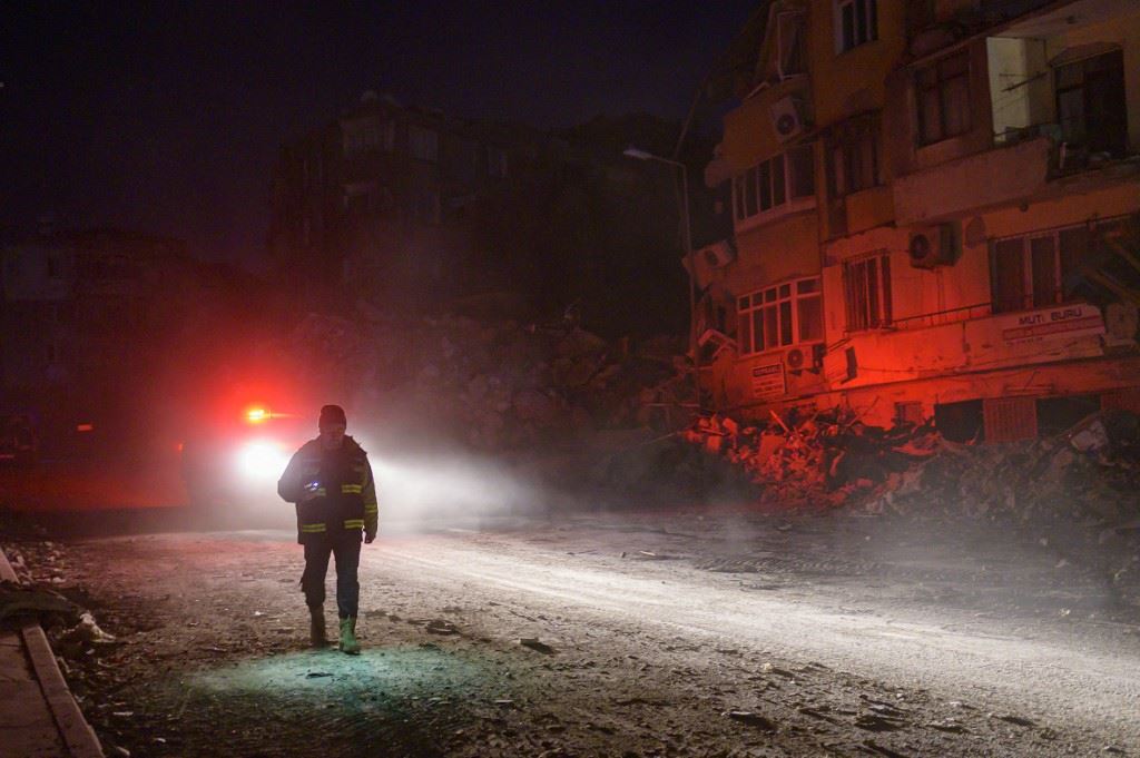 ضابط يسير أمام مبنى منهار في أنطاكيا، جنوب هاتاي (أ ف ب).