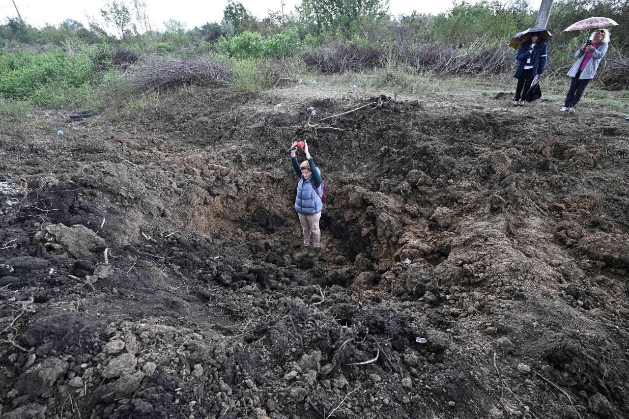 صحافي يقف في حفرة خلفها انفجار صاروخ خارج محطة بيفدينوكراينسك النووية في يوجنوكراينسك (20 أيلول 2022، أ ف ب).
