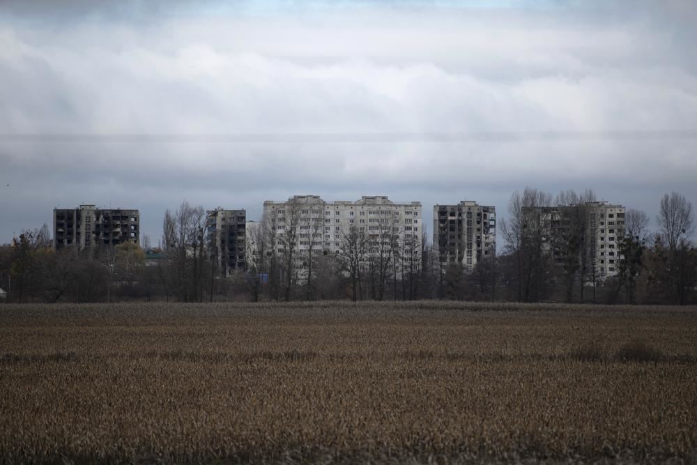 مبان سكنية دمرها القتال في بورودينكا بمنطقة كييف (13 ت2 2022، أ ب).