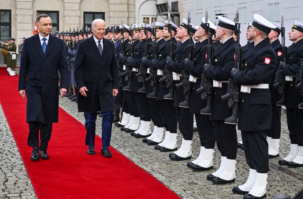 بايدن (إلى اليمين) ودودا يستعرضان حرس الشرف العسكري في القصر الرئاسي في وارسو (21 شباط 2023، أ ف ب).