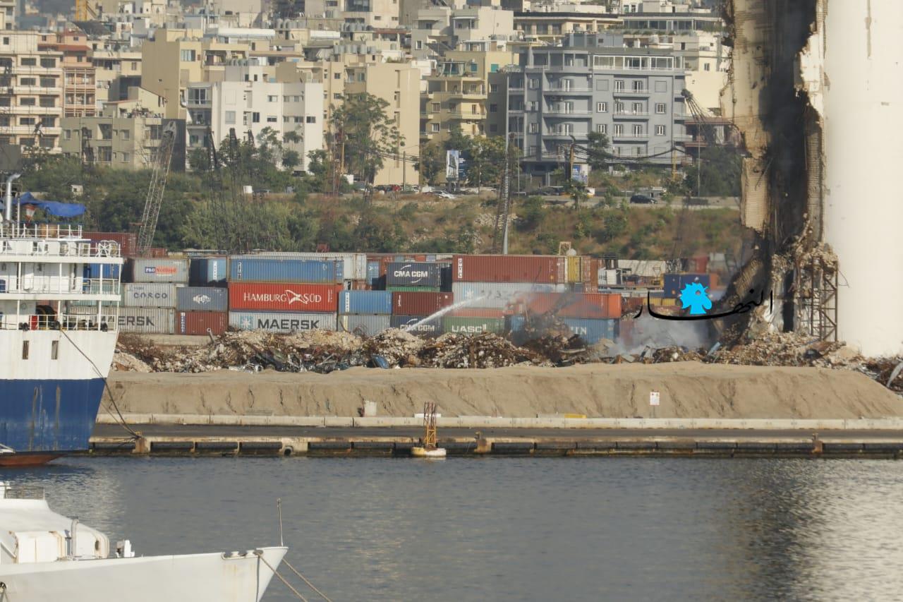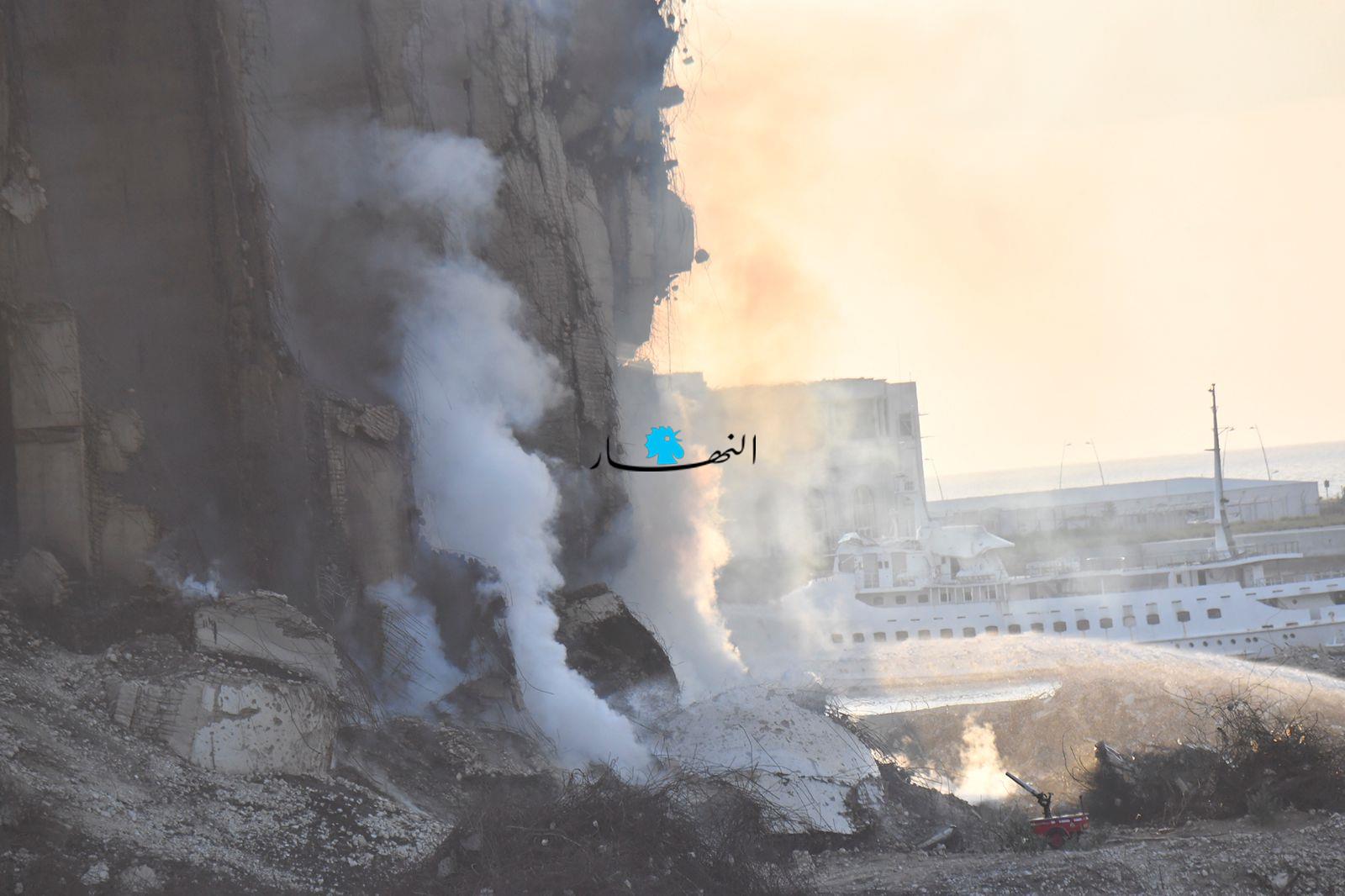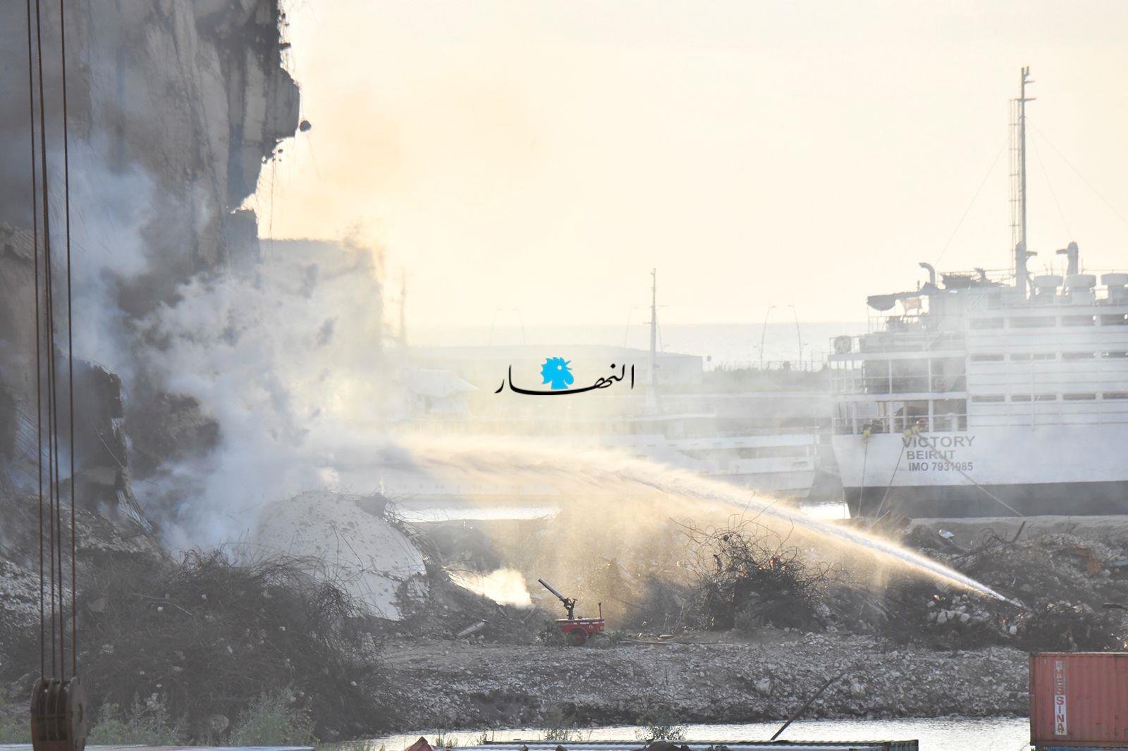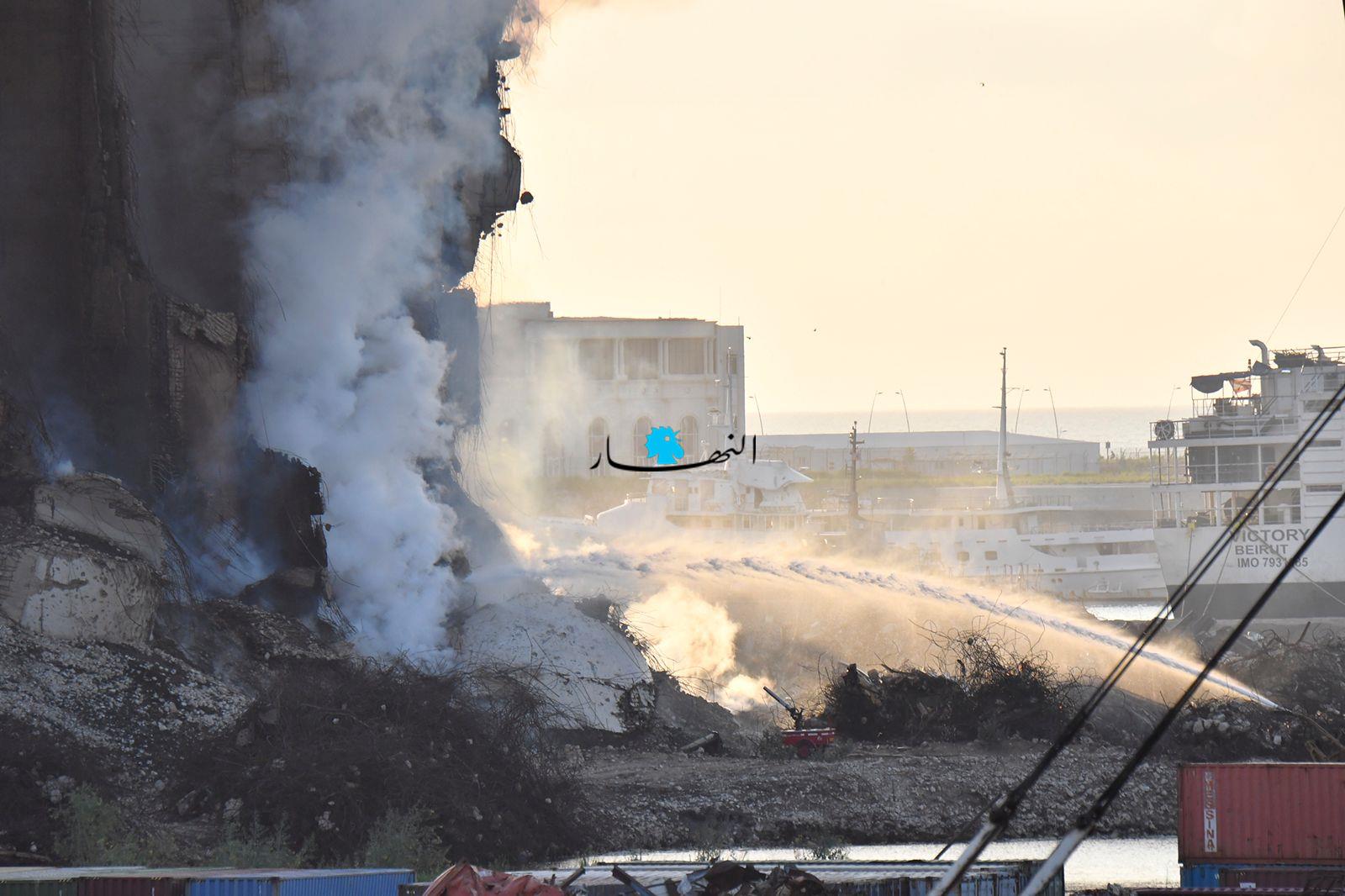 تواصل عناصر الدفاع المدني وفوج إطفاء بيروت العمل على إطفاء الحريق المندلع في أهراءات مرفأ بيروت منذ أسبوعين تقريباً، وتنصبّ جهود الفرق على الاستمرار بتبريد المكان منعاً لتجدُّد الحريق.