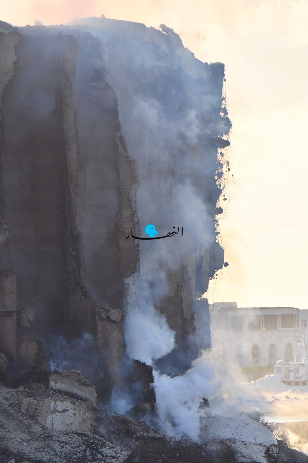 جانب من مبنى أهراءات مرفأ بيروت خلال عملية الإطفاء قبيل المغيب (نبيل اسماعيل).