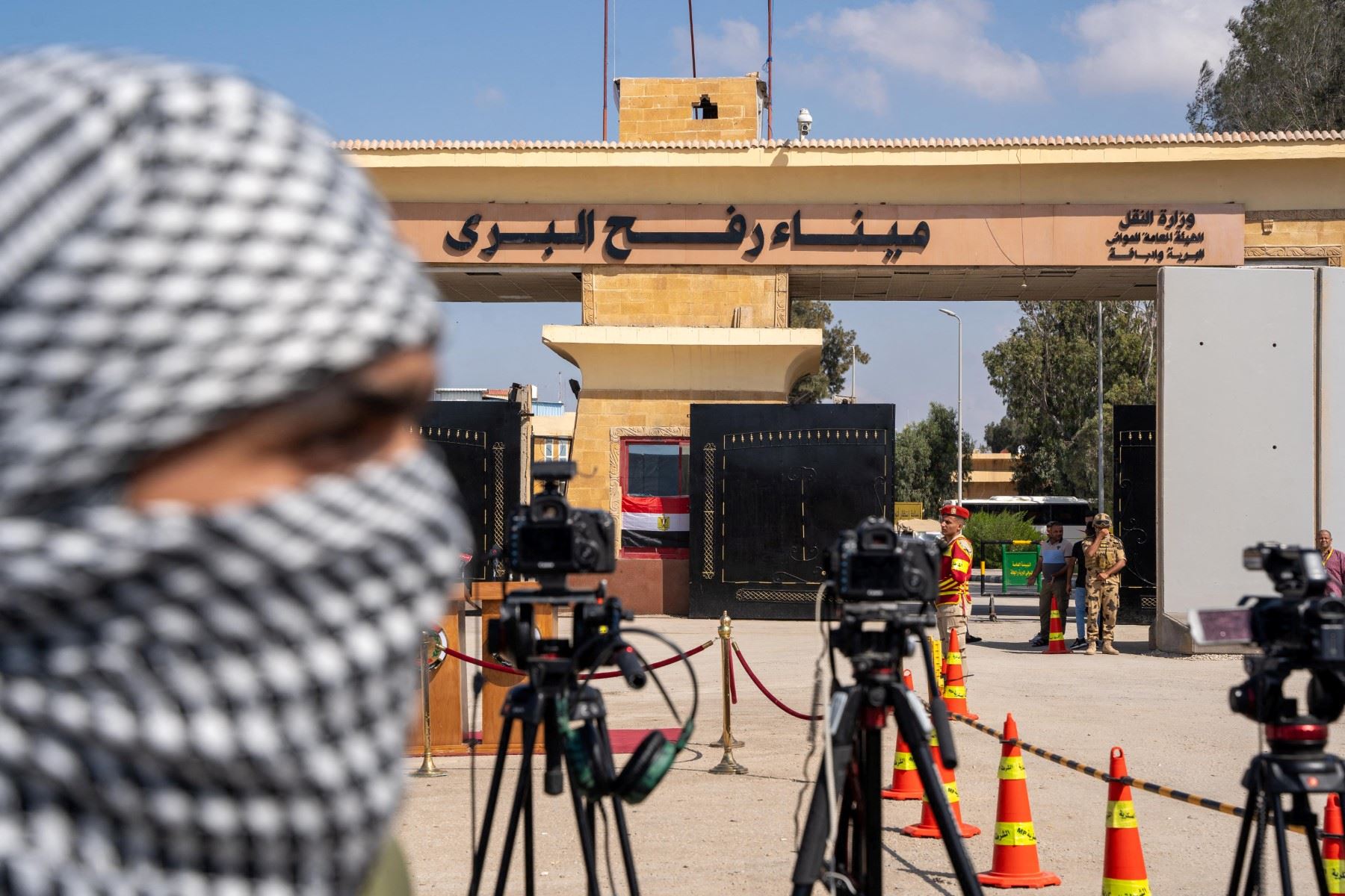 متظاهر فلسطيني يقف خلف الكاميرات عند معبر رفح على الحدود مع قطاع غزة (أ ف ب).