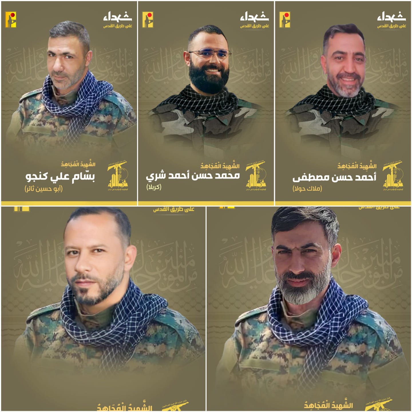 ونعى "حزب الله" حمسة من عناصره الذين استهدفوا في الغارة الإسرائيلية على بلدة بيت ياحون، وهم كل من عباس محمد رعد من بلدة جباع، خليل جواد شحيمي "سراج" من بلدة مركبا، أحمد حسن مصطفى "ملاك حولا" من بلدة حولا، محمد حسن أحمد شري "كربلا" من بلدة خربة سلم وبسام علي كنجو "أبو حسين ثائر" من بلدة شقرا في جنوب لبنان.