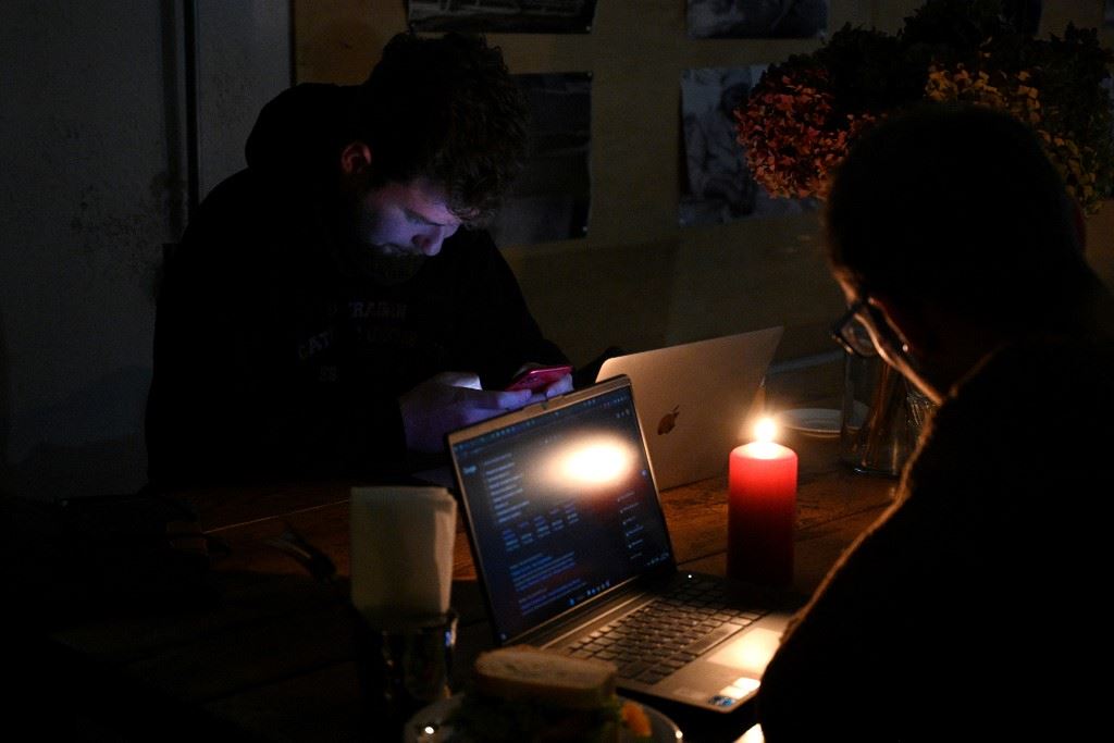 أشخاص جلسوا في مقهى في لفيف في ضوء شموع وسط انقطاع التيار الكهربائي (24 ت2 2022، أ ف ب).