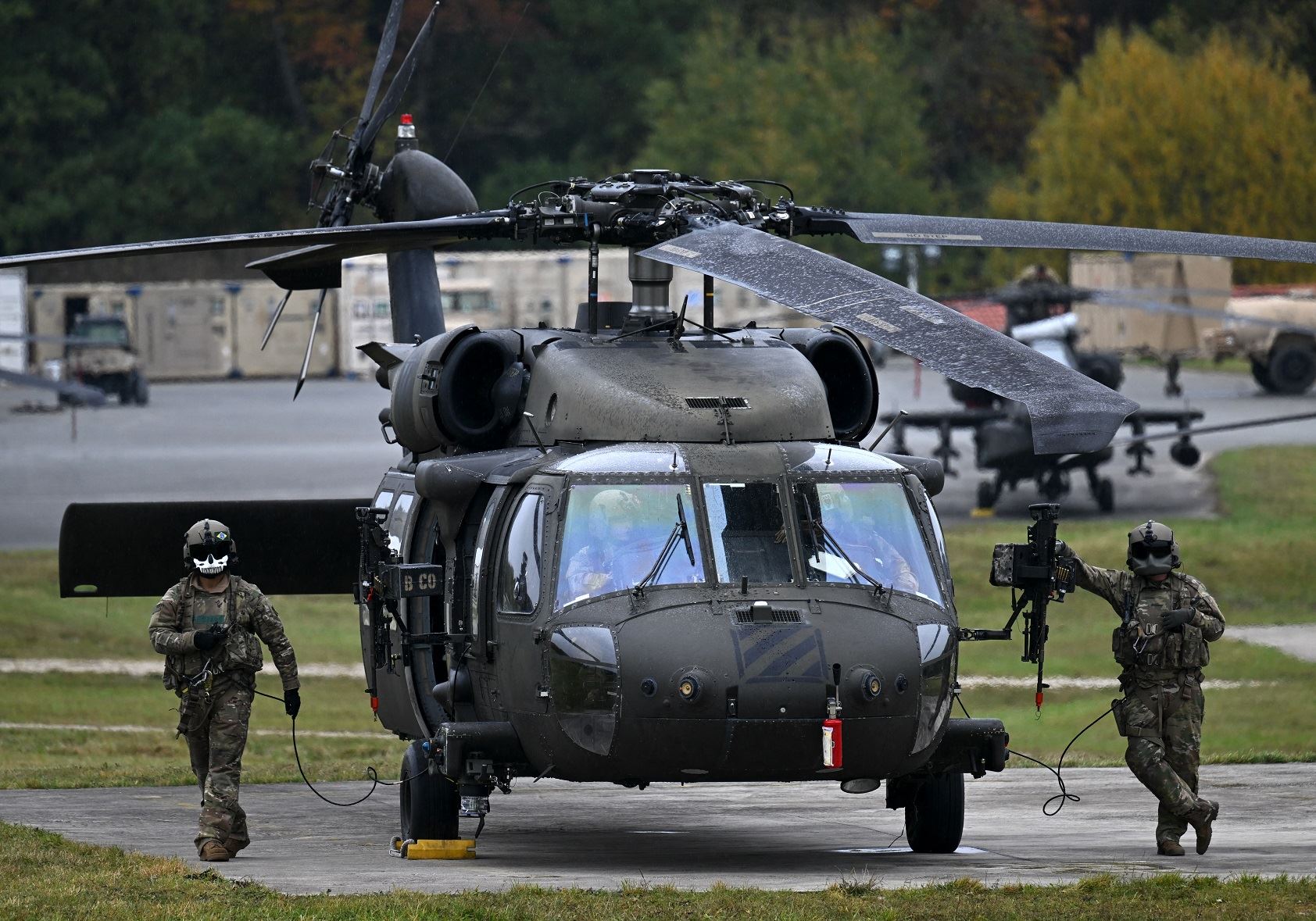 جنديان أميركيان قرب مروحية "بلاك هوك" خلال تدريب في منطقة هوهنفيلز، جنوب ألمانيا (24 ت1 2023 - أ ف ب).