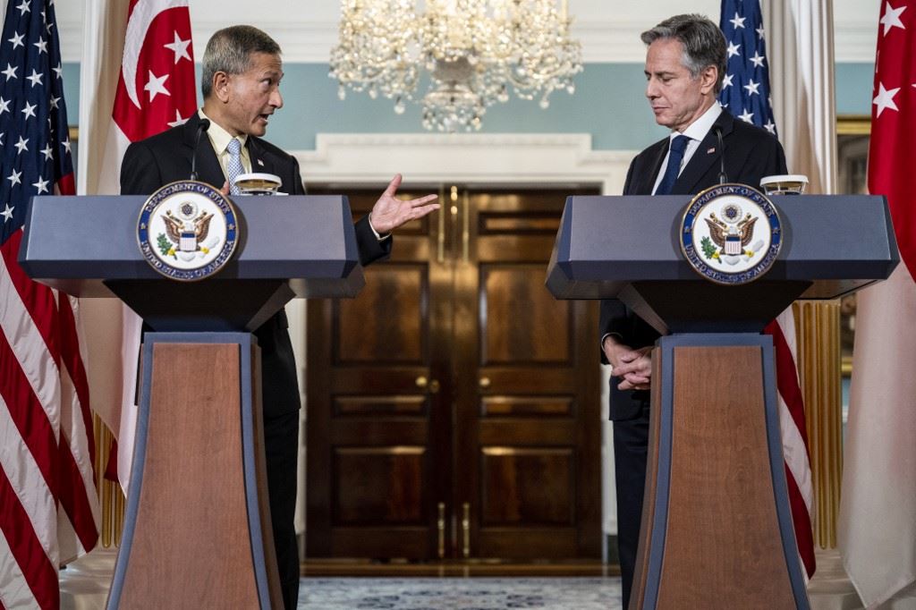 بلينكن خلال لقاء مع نطيره السنغافوري فيفيان بالاكريشنان في وزارة الخارجية الأميركية في واشنطن (16 حزيران 2023، ا ف ب).