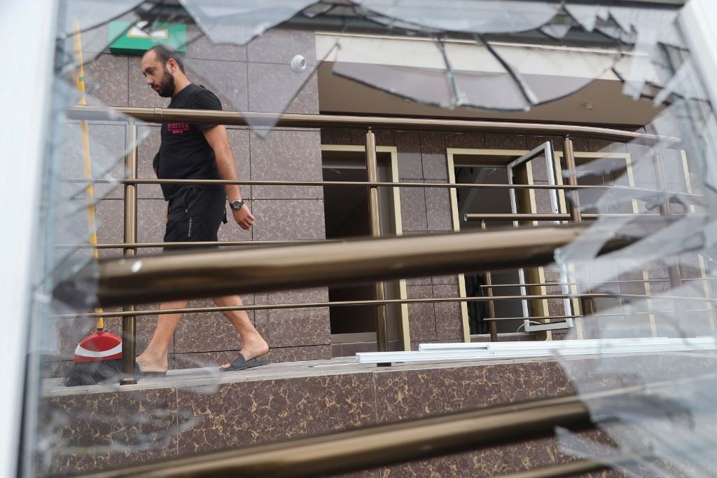 رجل يمر بالقرب من نافذة محطمة في مبنى سكني تضرر نتيجة سقوط صاروخ خلال غارة ليلية في أوديسا (19 تموز 2023، أ ف ب).