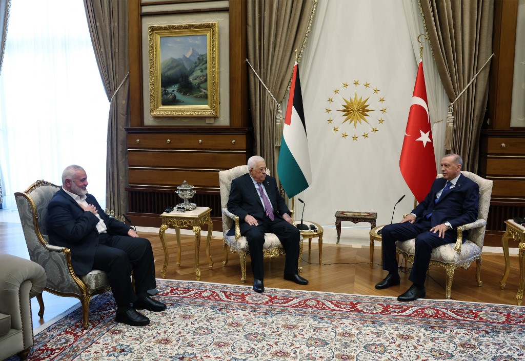 إردوغان (في الوسط) مع عباس (إلى اليسار) وهنية في المجمع الرئاسي في أنقرة (26 تموز 2023، أ ف ب).