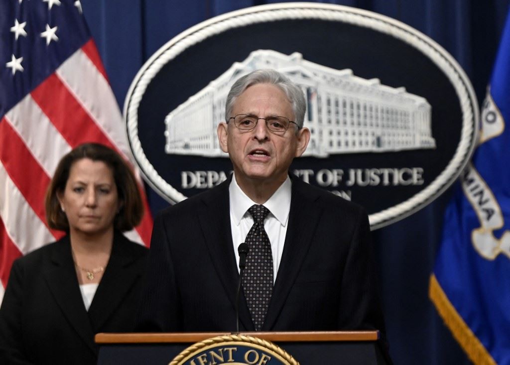 غارلاند يعقد مؤتمرا صحافيا في مقر وزارة العدل في واشنطن (27 ك2 2023، أ ف ب).