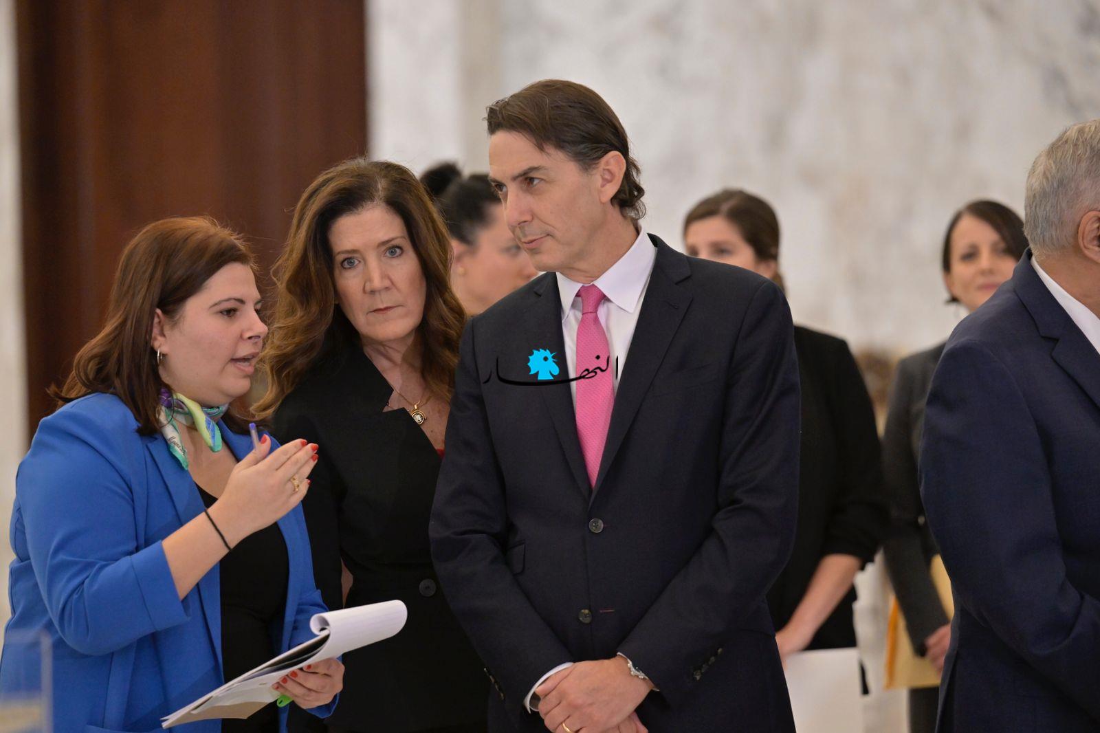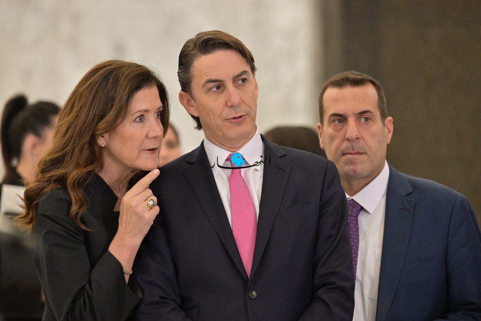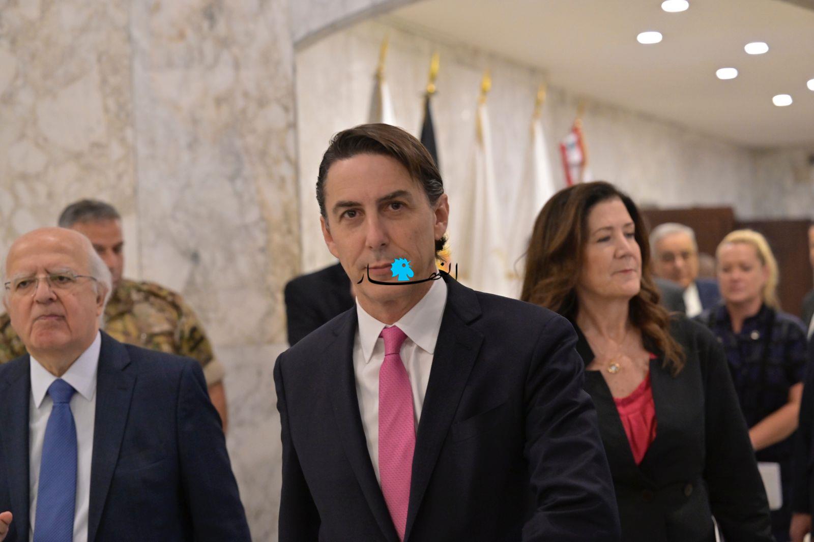 هوكشتاين إلى جانب السفيرة الأميركية وبوصعب في قصر بعبدا بعد تسليم عون رسالة اتفاق الترسيم البحري مع إسرائيل (نبيل اسماعيل).