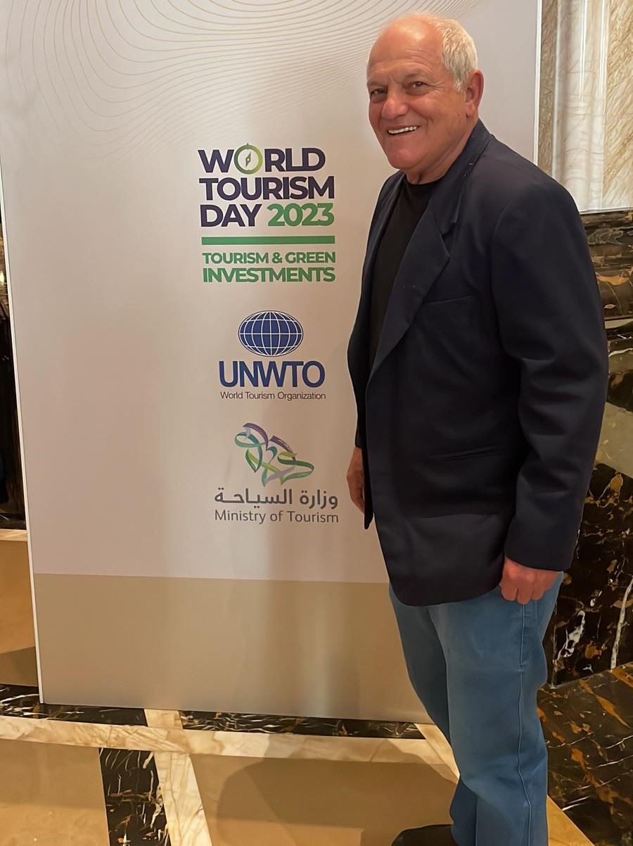 كاتس يقف بجانب ملصق لمنظمة السياحة العالمية في الرياض (26 ايلول 2023، اكس).
