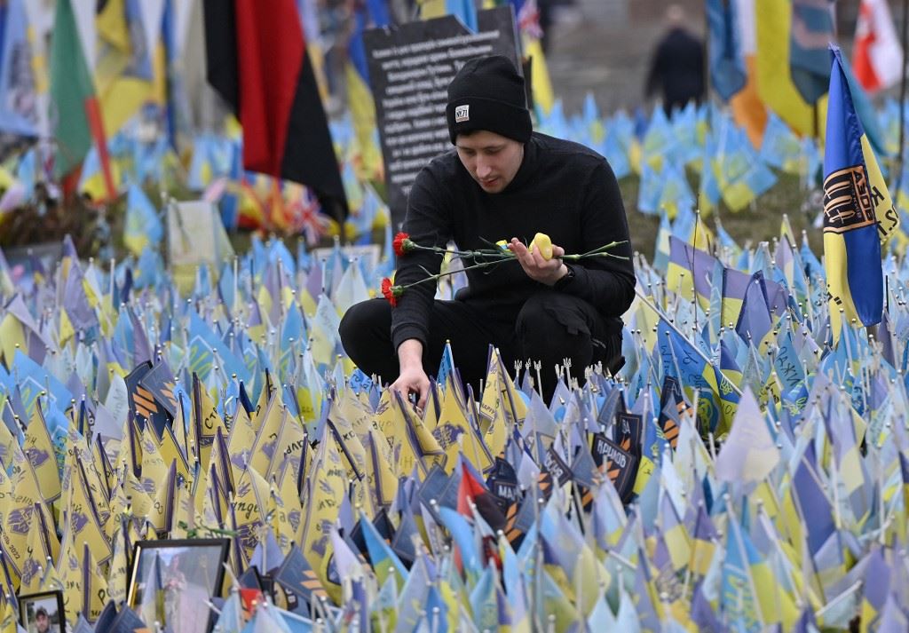 رجل يضع زهورا عند نصب تذكاري موقت للجنود الأوكرانيين القتلى في ميدان الاستقلال بكييف (15 آذار 2024ـ أ ف ب).